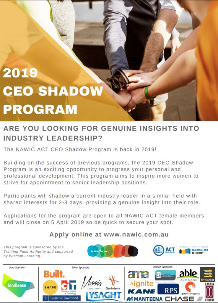 APPLICATIONS NOW OPEN. Building on the success of our previous CEO Shadow Programs, we are pleased to announce that the NAWIC ACT CEO Shadow Program has officially launched and applications are now open for both CEO’s and Shadows wishing to participate in 2019! Applications for the program are open to all NAWIC ACT female members … Continue reading NAWIC ACT | CEO Shadow Program